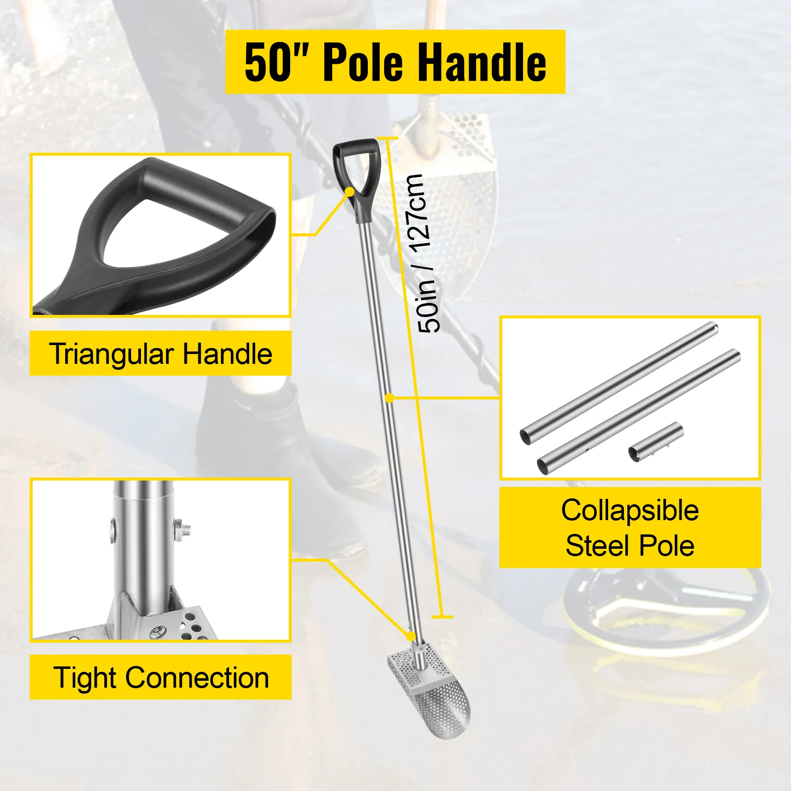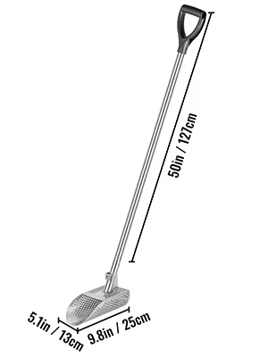 Esta pala para arena está diseñada para recoger y tamizar objetos pequeños y valiosos. Tiene una amplia gama de usos, como recoger arena en la playa, buscar bajo el agua o trabajar con un detector de metales.