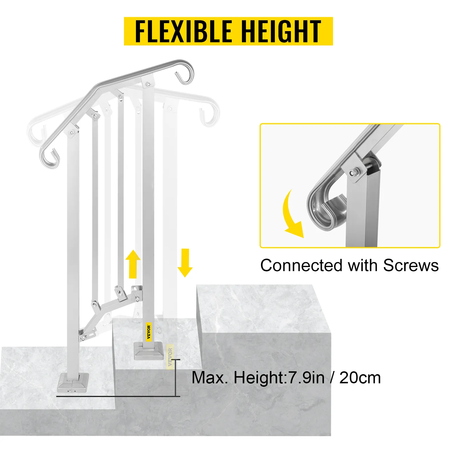 Gracias a la conexión por tornillo, este pasamanos para escalones se puede cambiar en altura para adaptarse a escalones de diferentes tamaños. La altura máxima de las escaleras es de 7,9"/20 cm, flexible para satisfacer sus diversas necesidades.