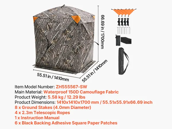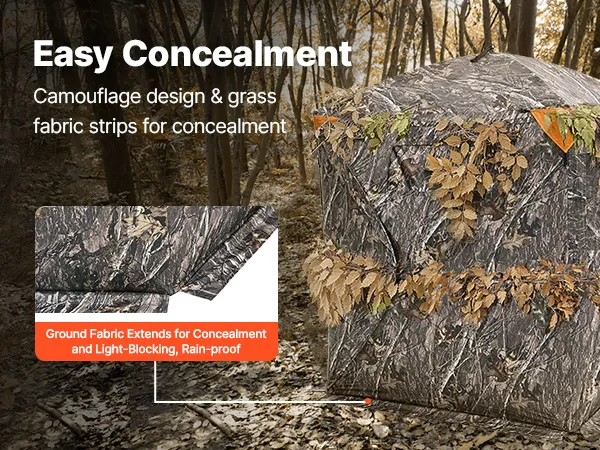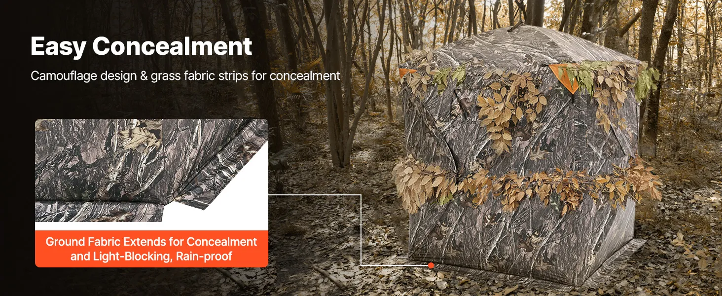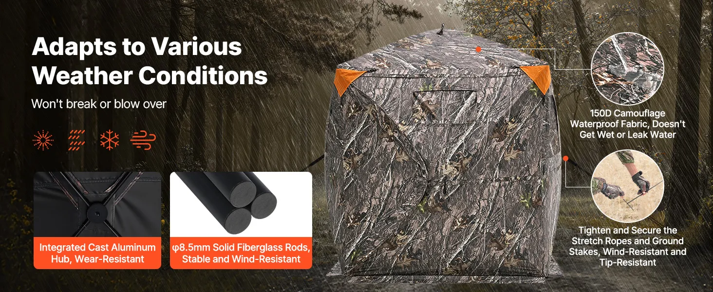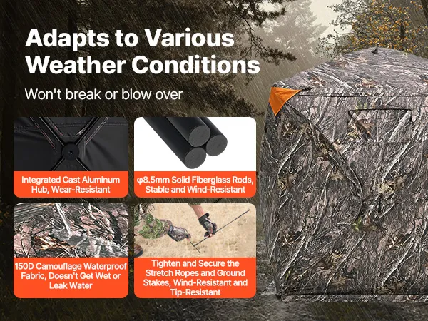 Resistente a las inclemencias del tiempo: Nuestro buje de aluminio mejorado cuenta con una estructura robusta. El escondite para caza está fabricado con tela impermeable de 150D, resistente a la lluvia y al viento. Los tubos de fibra de vidrio sólida son desmontables. Se puede colocar tela reflectante.