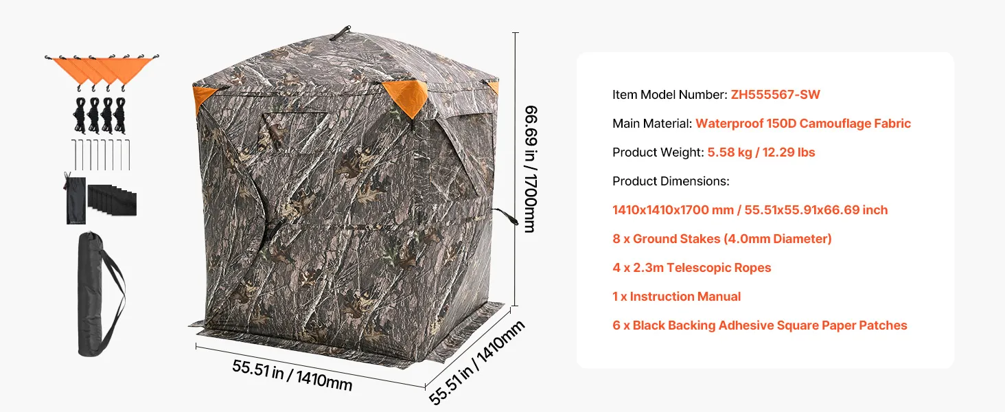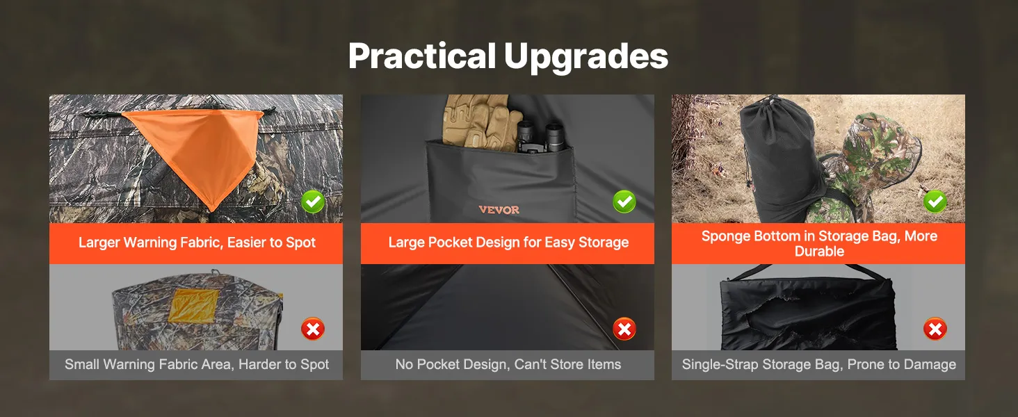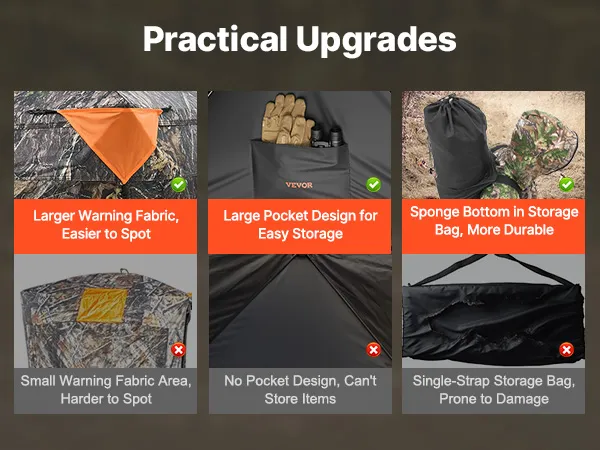 Diseño espacioso: Dimensiones: 140 x 140 x 170 cm. Con un amplio interior, nuestra carpa para pavos y ciervos tiene capacidad para 2 o 3 personas. El refugio oculto, con tela de advertencia con diseño de rombos, es desmontable para mayor visibilidad y evitar lesiones accidentales.