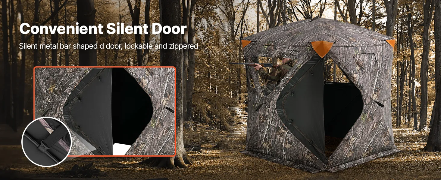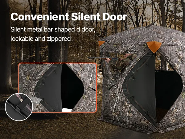 Mejora para una Caza Silenciosa: El escondite de caza utiliza un método silencioso con una estructura interna de barras de acero cosidas. La puerta tiene cerradura y cremallera, con cierre automático. Tres ventanas laterales de malla unidireccional y una ventana de observación cuadrada para mayor visibilidad.