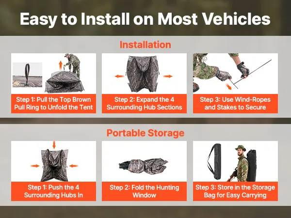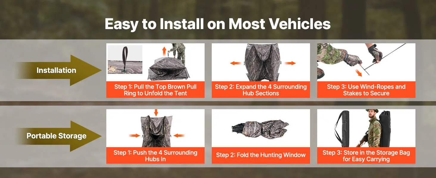 Fácil de transportar y montar: Gracias a su diseño plegable telescópico, puede guardar el escondite de caza portátil en una bolsa de almacenamiento con dos asas. Simplemente tire del punto central de cada lado y fíjelo con cuerdas de viento y estacas para completar la instalación.