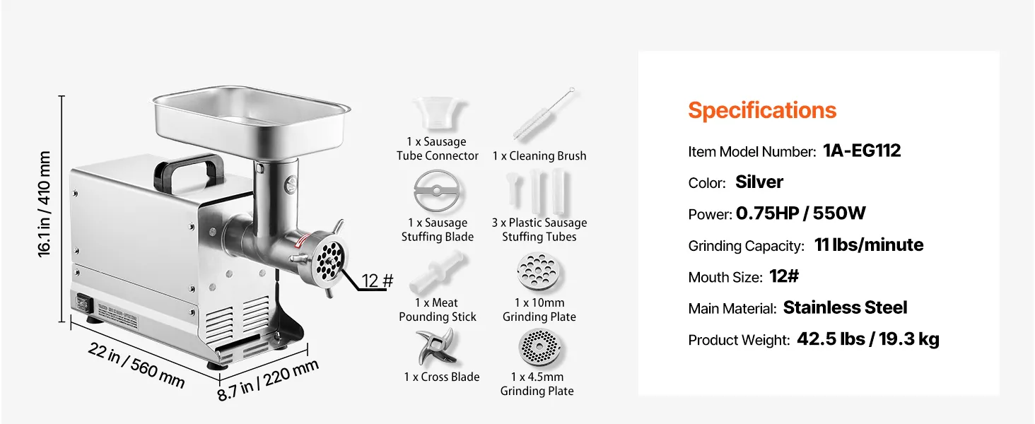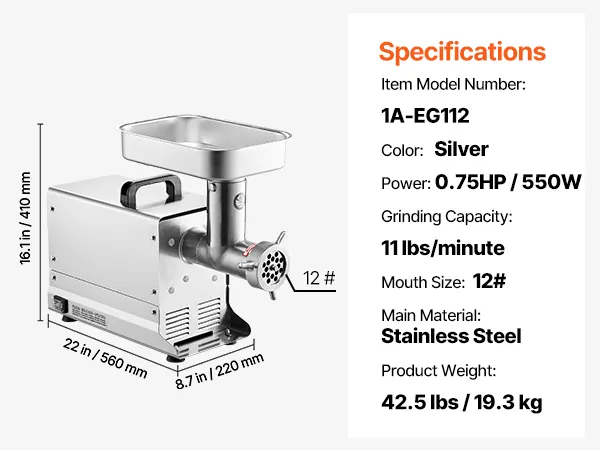 The commercial countertop meat grinder, mouth size 12#, features a highly efficient 550W pure copper motor capable of grinding 11 lbs of meat per minute. Made of stainless steel, it's sturdy and durable. The SUS420 blade that can grind various types of meat, making it ideal for commercial use.