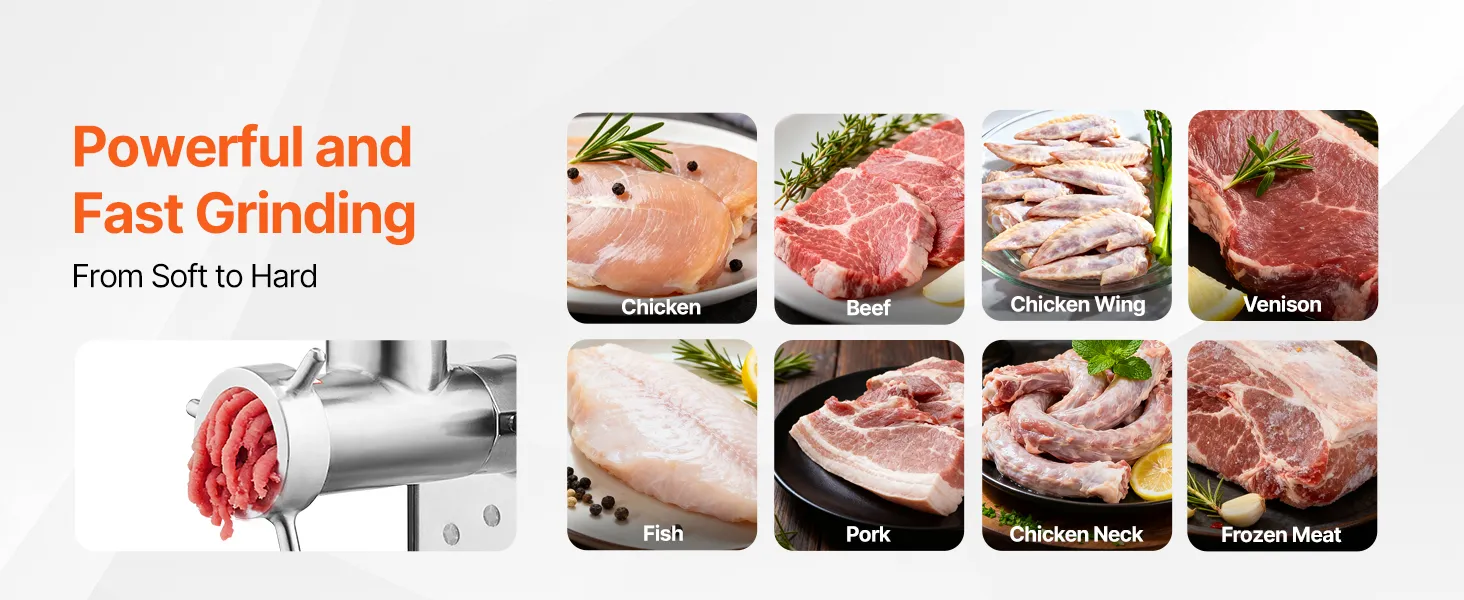 Versatile Accessories: The machine comes with two types of meat grinder blades, one sausage stuffing blade, and three different sizes of sausage stuffing tubes, allowing you to grind various meats such as pork, beef, venison, chicken, and fish, as well as make sausages and more.