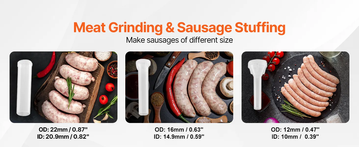 The commercial meat grinder includes three different diameters of sausage tubes, making it easy for you to make sausages of various sizes. Perfect for use in kitchens, bars, restaurants, and food processing facilities.