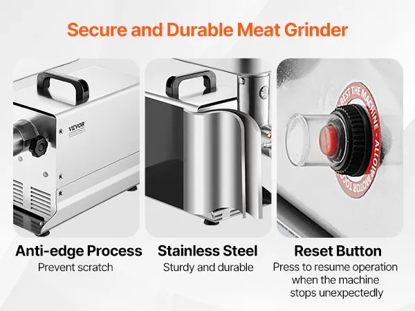 Our countertop meat grinder is constructed from robust, fully stainless steel, resistant to corrosion and wear. All parts in contact with food are made from food-grade materials, ensuring safety and durability.