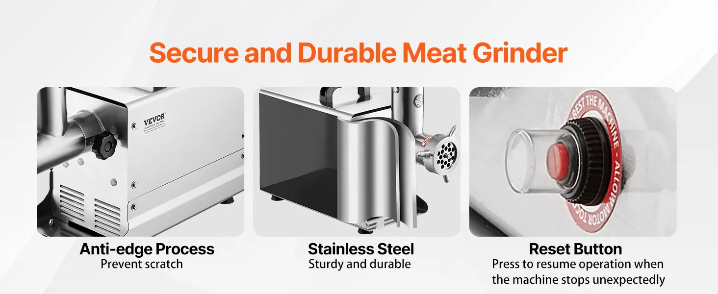 Robust Construction: The entire machine is made of stainless steel, with sharp SUS420 blades that are durable and capable of grinding chicken cartilage, frozen meat, and more.