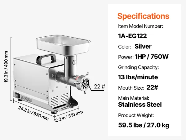 Fast Meat Grinding: The commercial countertop meat grinder, mouth size 22#, features a highly efficient 750W pure copper motor capable of grinding 13 lbs of meat per minute. It can operate continuously without interruption, making it ideal for large-scale commercial meat grinding needs. Avoid letting the grinder idle for too long as it may damage the motor. Remember to promptly turn off the power when not in use.