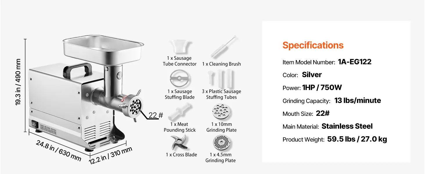 The commercial countertop meat grinder, mouth size 22#, features a highly efficient 750W pure copper motor capable of grinding 13 lbs of meat per minute. Made of stainless steel, it's sturdy and durable. The SUS420 blade that can grind various types of meat, making it ideal for commercial use.