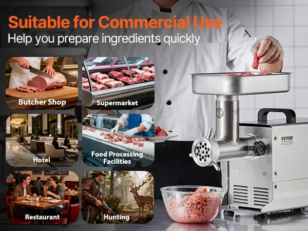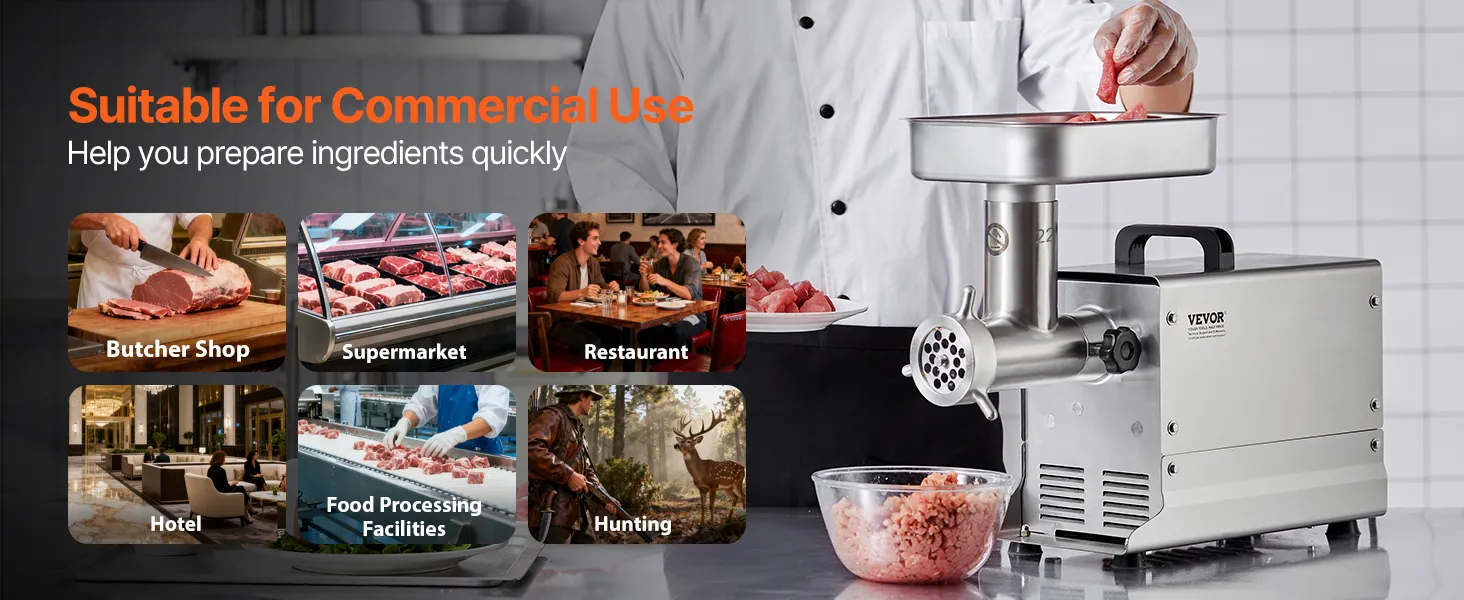 This meat grinder is suitable for grinding various types of meat, making it ideal for use in butcher shops, supermarkets, restaurants, hotels, and food processing facilities.