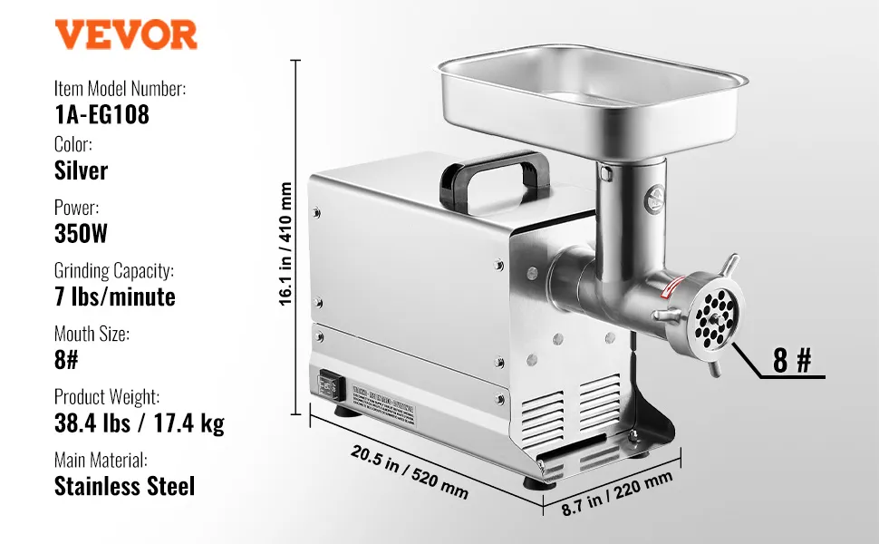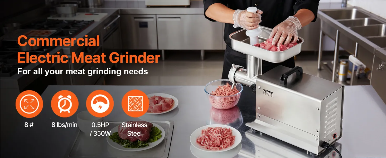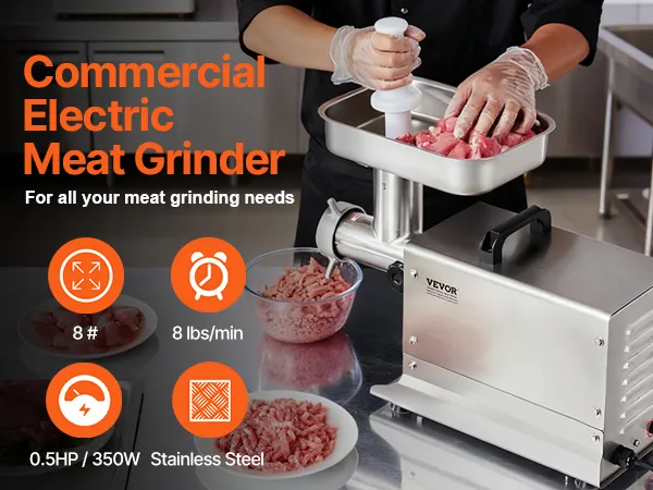 La picadora de carne de sobremesa comercial, con boca de 8 lb, cuenta con un motor de cobre puro de 350 W de alta eficiencia capaz de moler 7 lb de carne por minuto. Fabricada en acero inoxidable, es resistente y duradera. La cuchilla SUS420 puede moler varios tipos de carne, lo que la hace ideal para uso comercial.