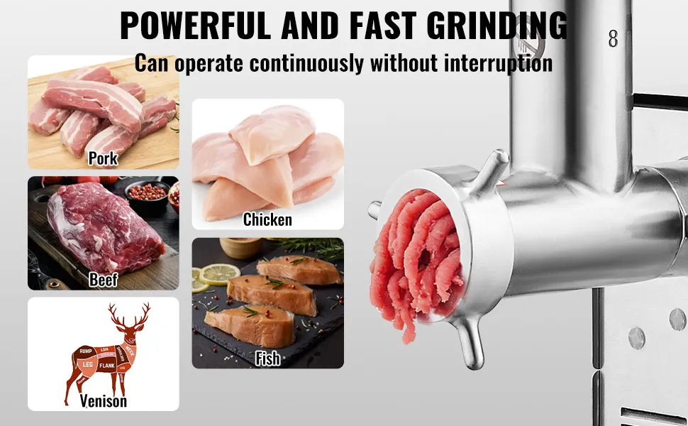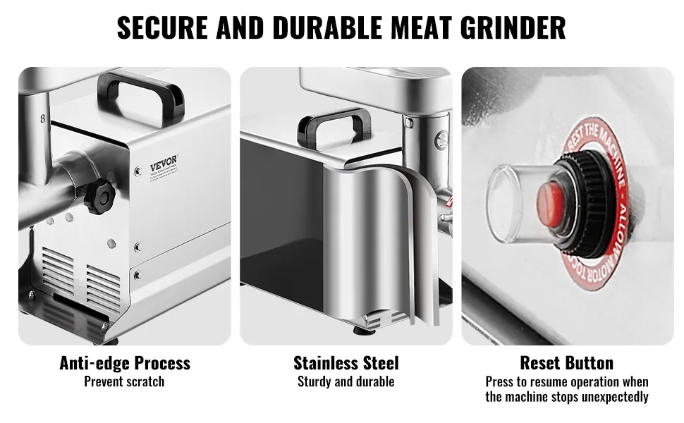 Construcción robusta: toda la máquina está hecha de acero inoxidable, con cuchillas afiladas SUS420 que son duraderas y capaces de moler cartílago de pollo, carne congelada y más.