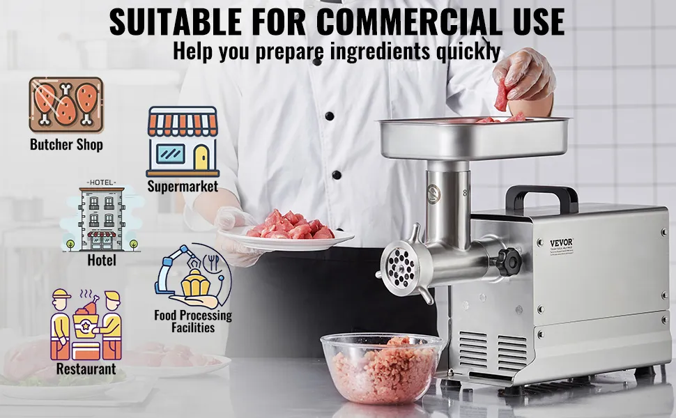 Esta picadora de carne es adecuada para moler varios tipos de carne, lo que la hace ideal para su uso en carnicerías, supermercados, restaurantes, hoteles e instalaciones de procesamiento de alimentos.