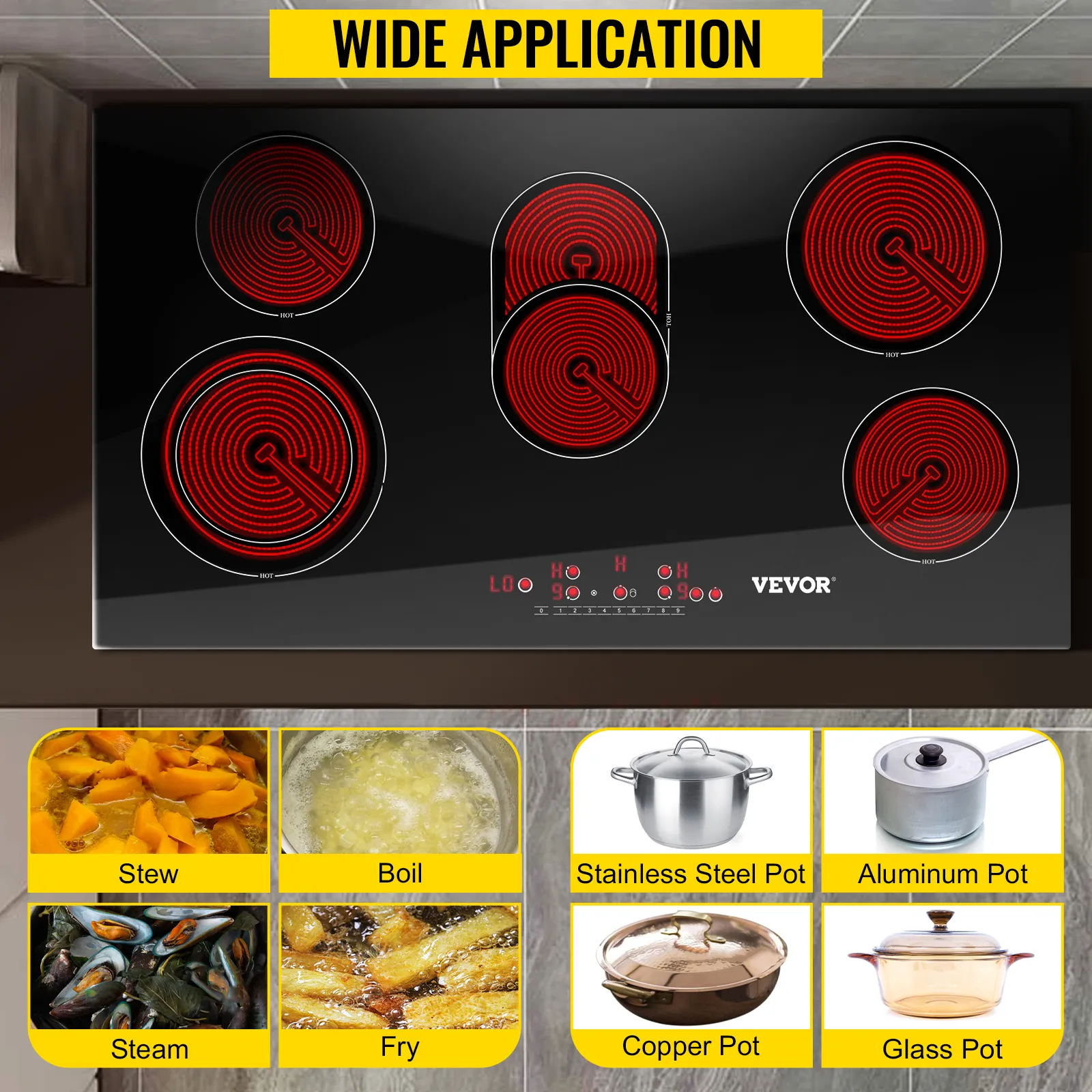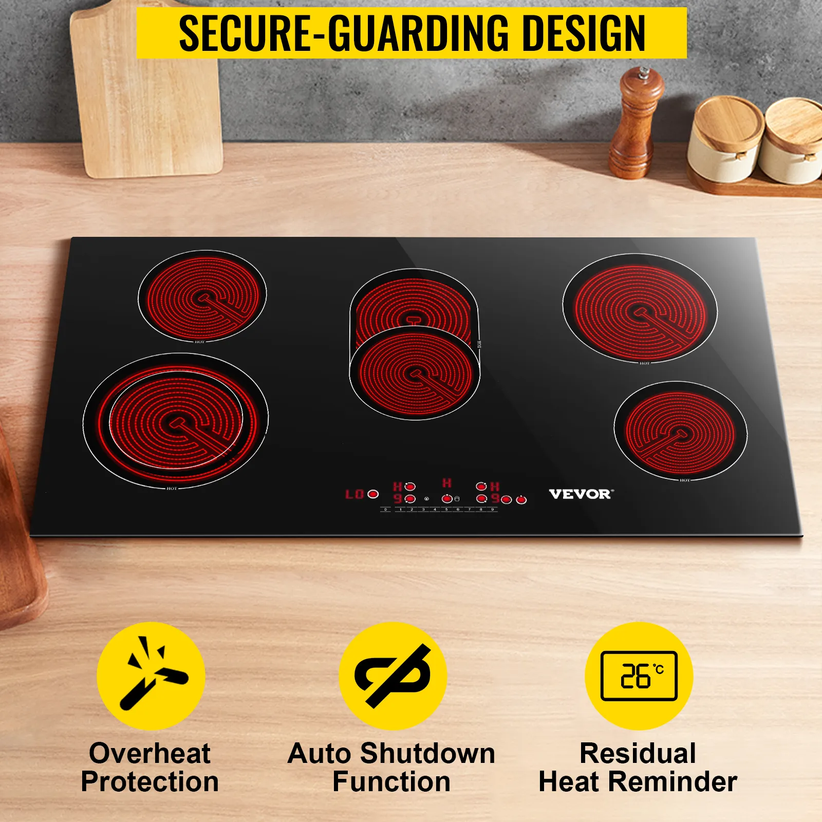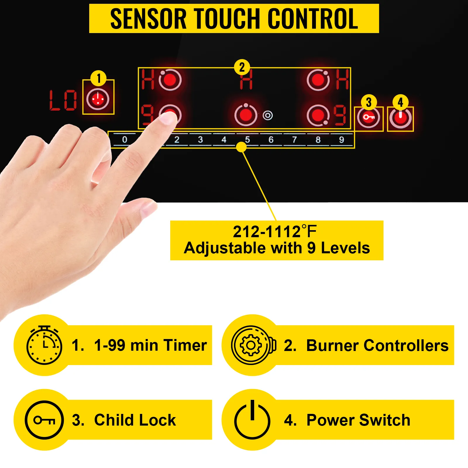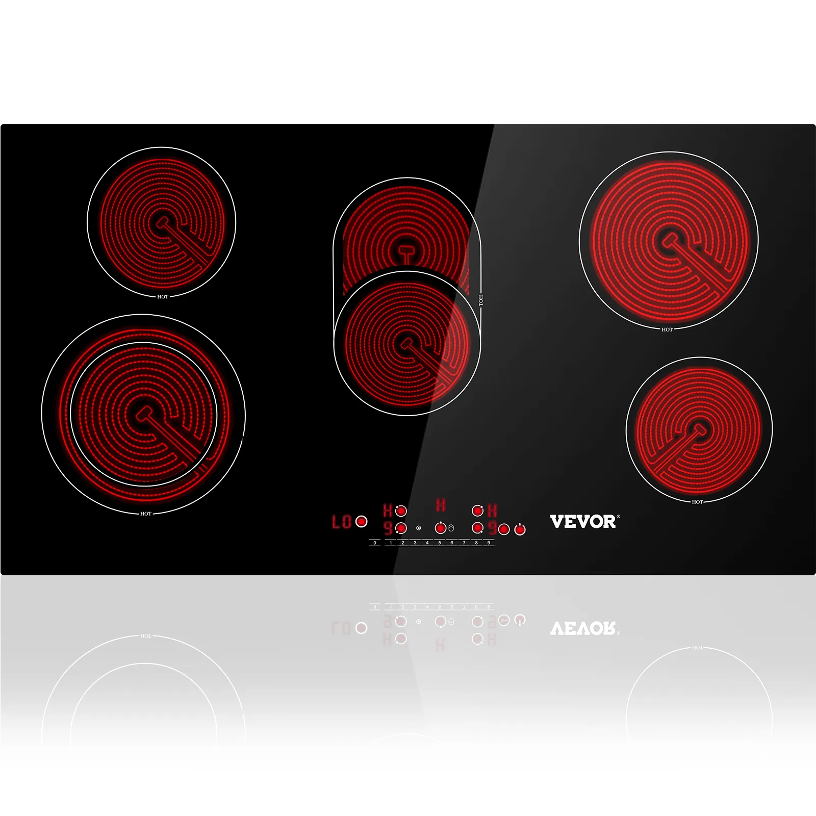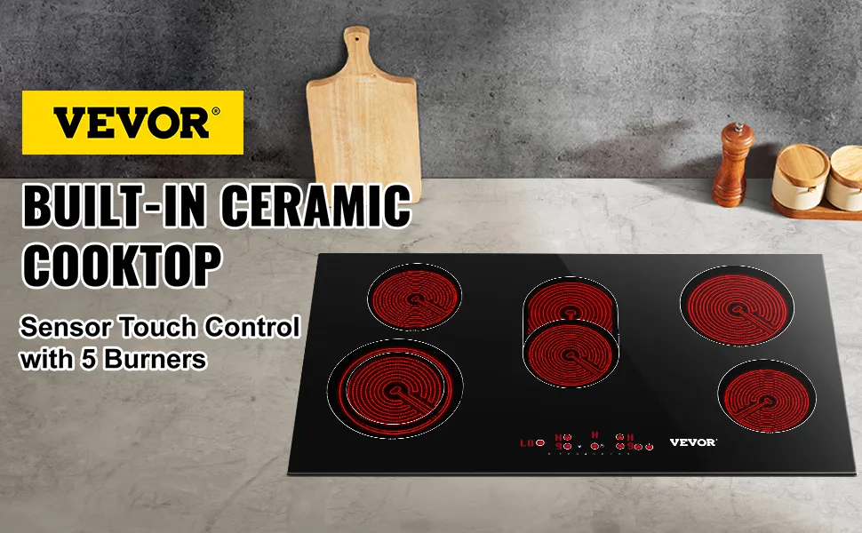 Nuestra placa radiante adopta 5 Quemadores de gran potencia, que ofrecen un calentamiento rápido y estable. Está equipado con controles táctiles con sensor con 9 niveles de calefacción y una función de temporizador. Mientras tanto, existen varias medidas para la seguridad de uso, que incluyen bloqueo para niños, protección contra sobrecalentamiento, apagado automático e indicador de calor residual. Esta vitrocerámica empotrada es su excelente compañera de cocina.