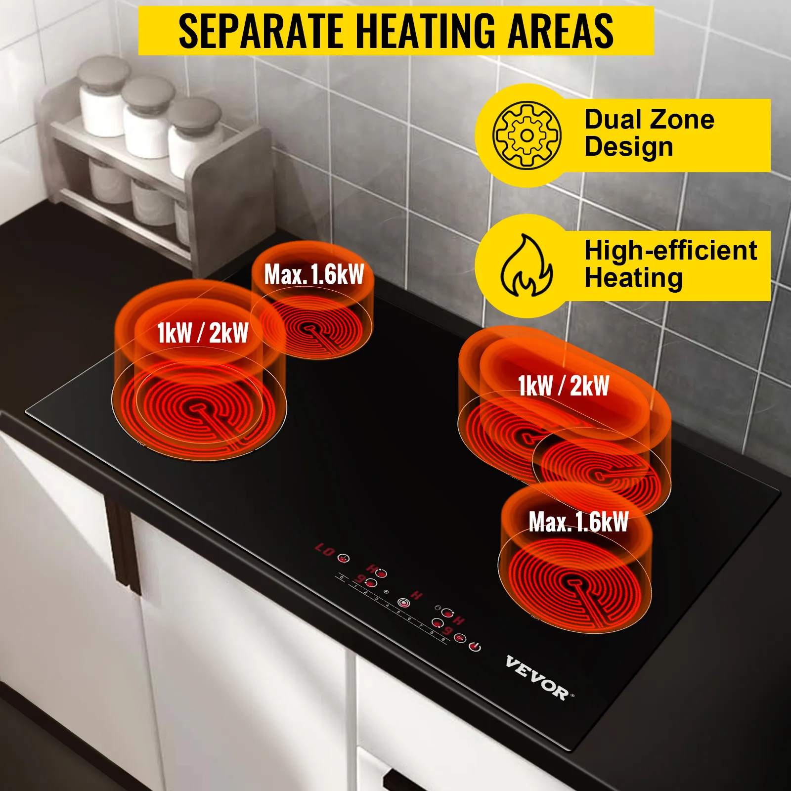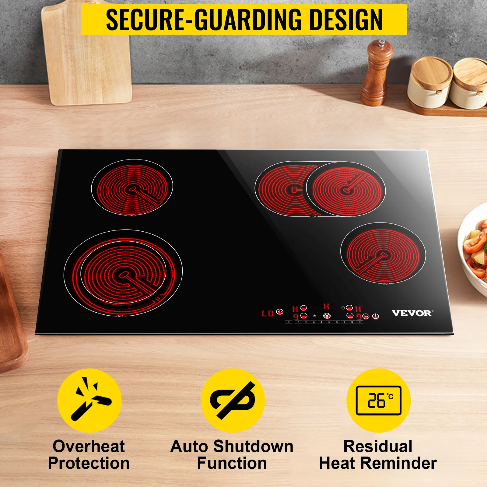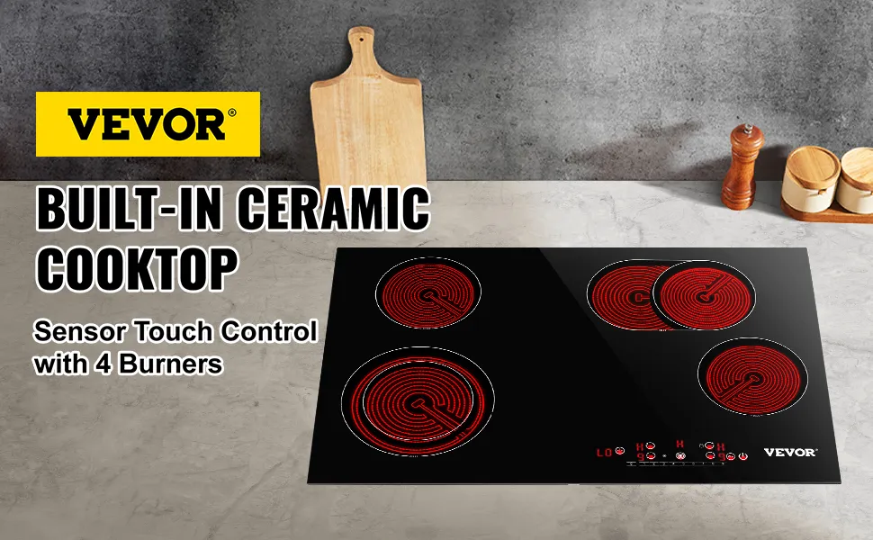 Nuestra placa radiante adopta 4 quemadores de gran potencia, que ofrecen un calentamiento rápido y estable. Está equipado con controles táctiles con sensor con 9 niveles de calefacción y una función de temporizador. Mientras tanto, existen varias medidas para la seguridad de uso, que incluyen bloqueo para niños, protección contra sobrecalentamiento, apagado automático e indicador de calor residual. Esta vitrocerámica empotrada es su excelente compañera de cocina.