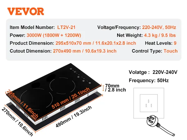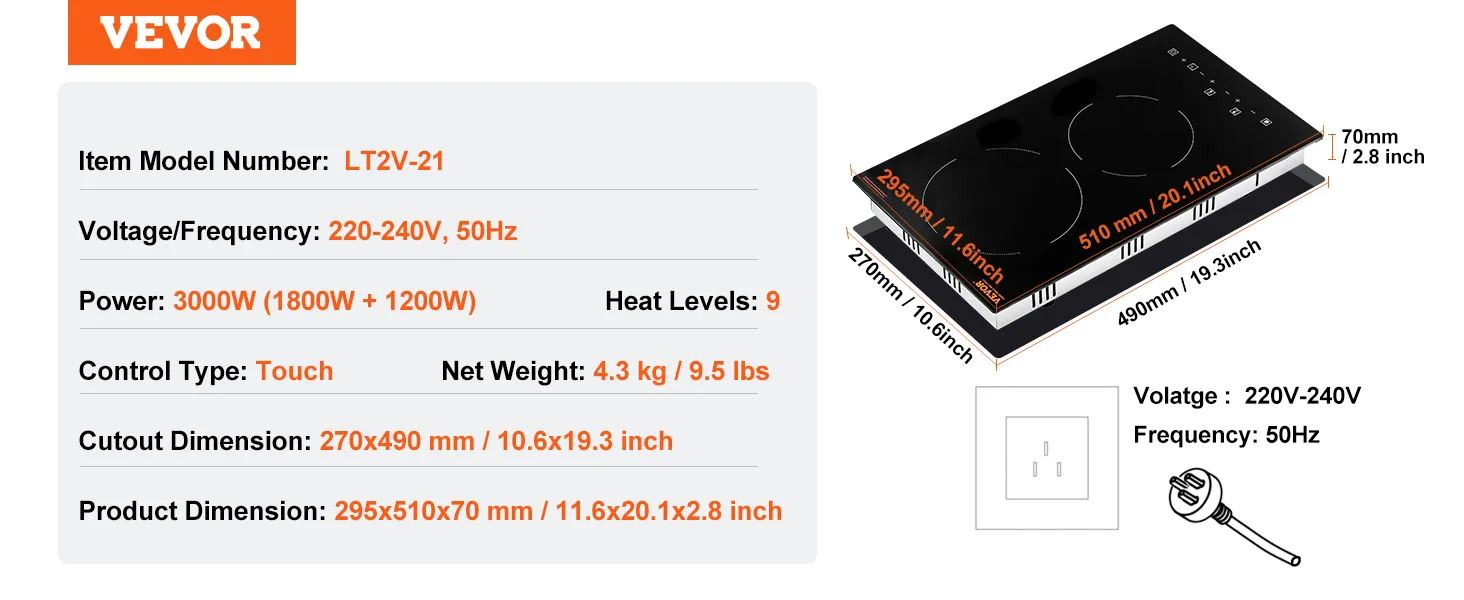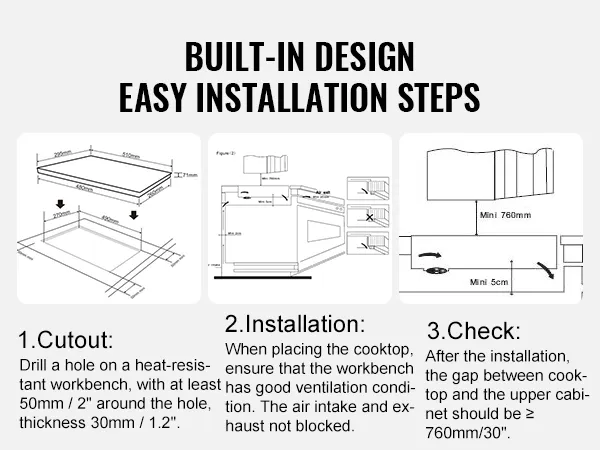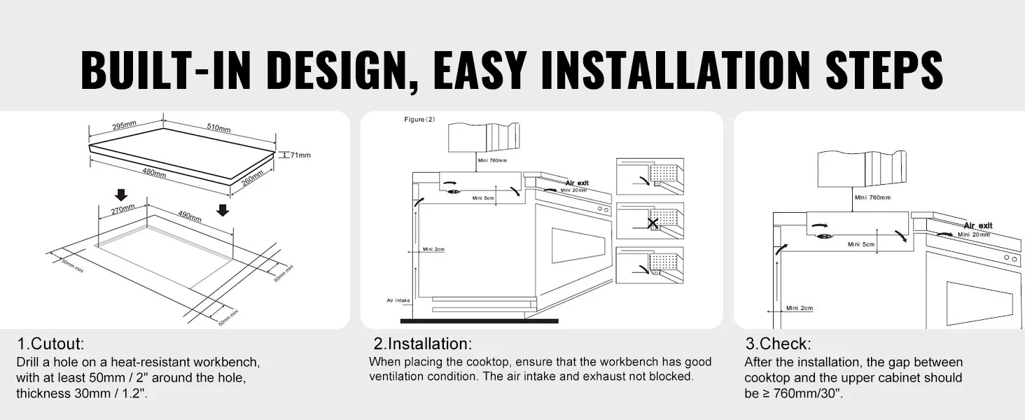 Diseño incorporado: con el tamaño de corte de 10,7 x 19,4 pulgadas, esta estufa de 11,6 x 20 pulgadas adopta un diseño incorporado, conveniente para su instalación y ahorra espacio en su cocina. Apto para tensiones de 220-240V, 50/60Hz.