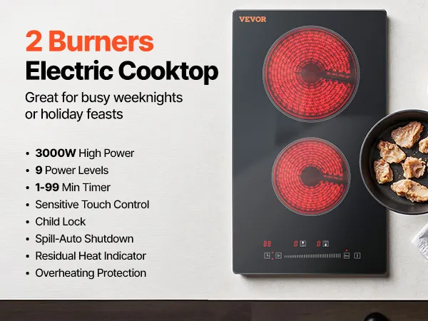 Zonas de cocción separadas: Nuestra placa de cocción cerámica cuenta con 2 zonas de cocción independientes con una potencia total de 3000W. La superficie de nuestra estufa radiante está hecha de vidrio, lo que garantiza que sea resistente al calor y fácil de limpiar. Además, el cuerpo tiene una excelente disipación de calor y es resistente y duradero para un uso prolongado. Esta estufa es su mejor opción para una experiencia culinaria de alta calidad.