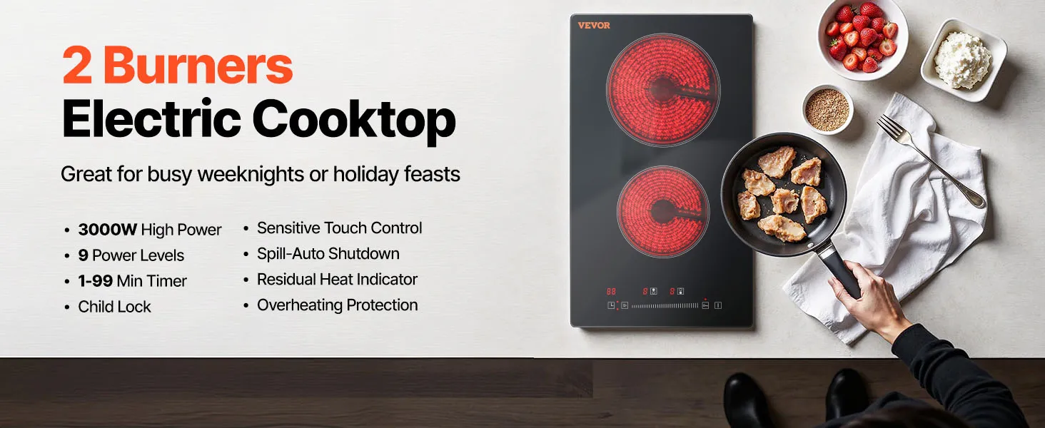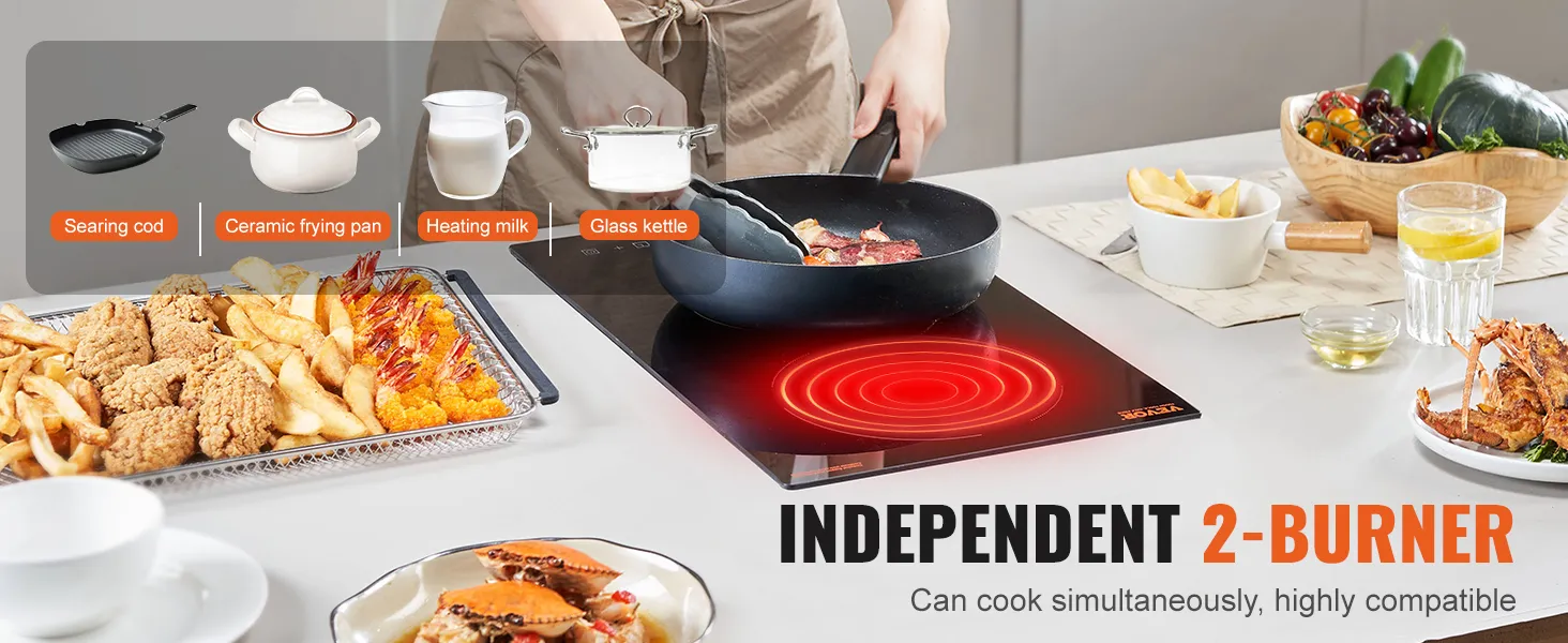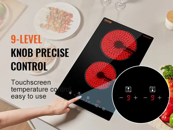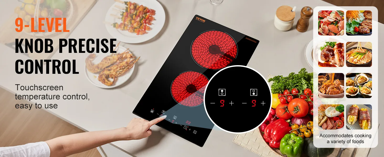 VEVOR Estufa eléctrica integrada, 20 x 11,6 pulgadas, 2 quemadores, estufa radiante de vidrio de 240 V con control táctil de sensor, temporizador y bloqueo para niños incluidos, 9 niveles de potencia para cocinar a fuego lento y freír