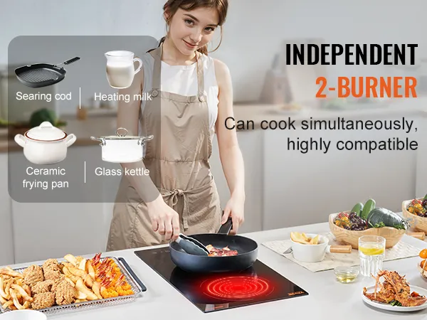 Funciona con cualquier utensilio de cocina: Puede utilizar cualquier utensilio de cocina con esta estufa eléctrica radiante, como sartenes de aluminio, sartenes de cobre, sartenes de hierro fundido y sartenes de acero inoxidable no magnéticos. Puedes cocinar con 2 fogones simultáneamente, aportando más eficiencia.