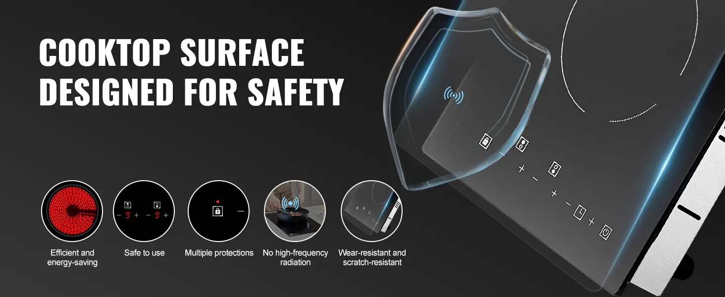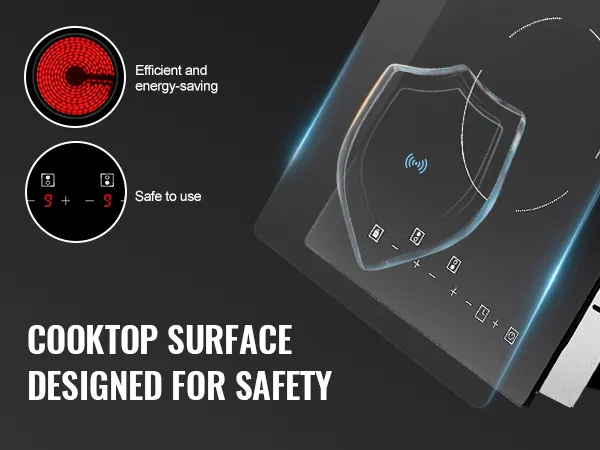 Nuestra estufa radiante está equipada con varias medidas de seguridad de uso, incluido bloqueo para niños, protección contra sobrecalentamiento, apagado automático en caso de derrames e indicador de calor residual, lo que le brinda una experiencia de usuario segura y tranquilizadora.