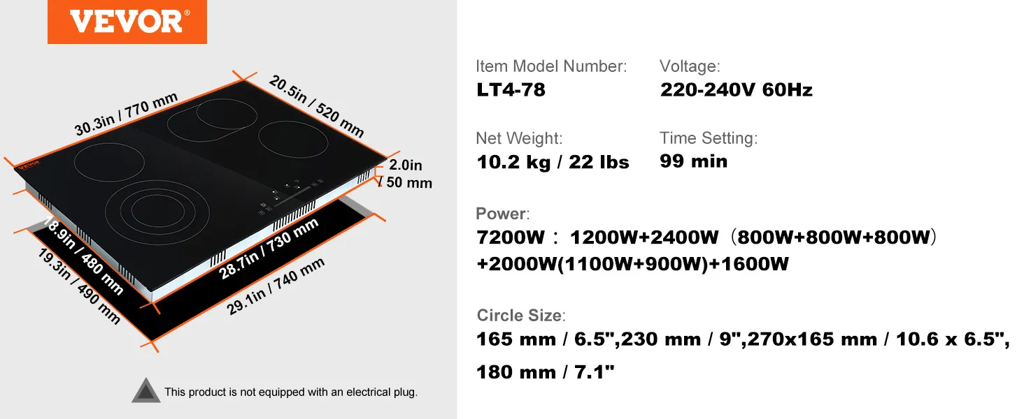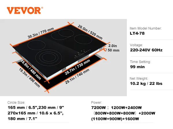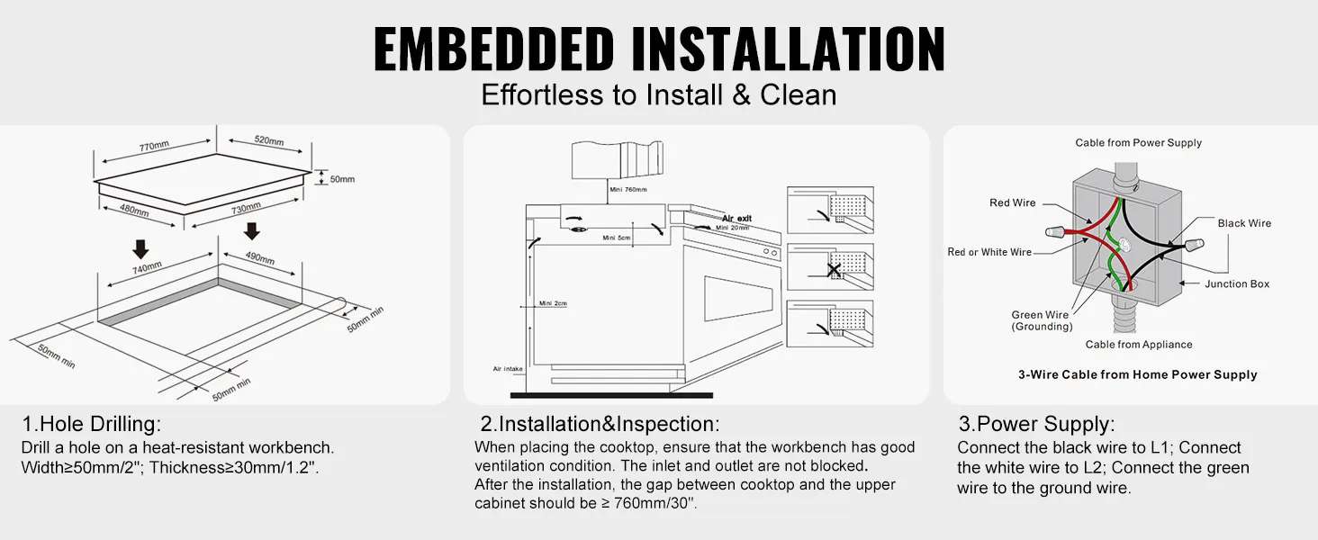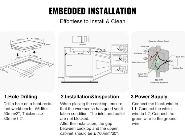 Diseño incorporado: con el tamaño de corte de 29,1 x 19,2 pulgadas, esta estufa de 30,3 x 20,5 pulgadas adopta un diseño incorporado, conveniente para su instalación y ahorra espacio en su cocina. Apto para tensiones de 220-240V, 60Hz.