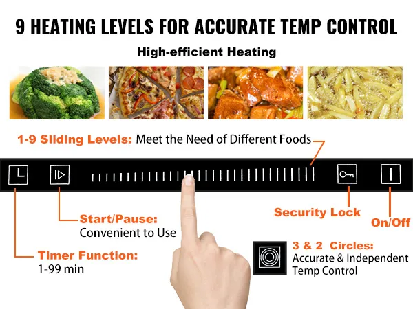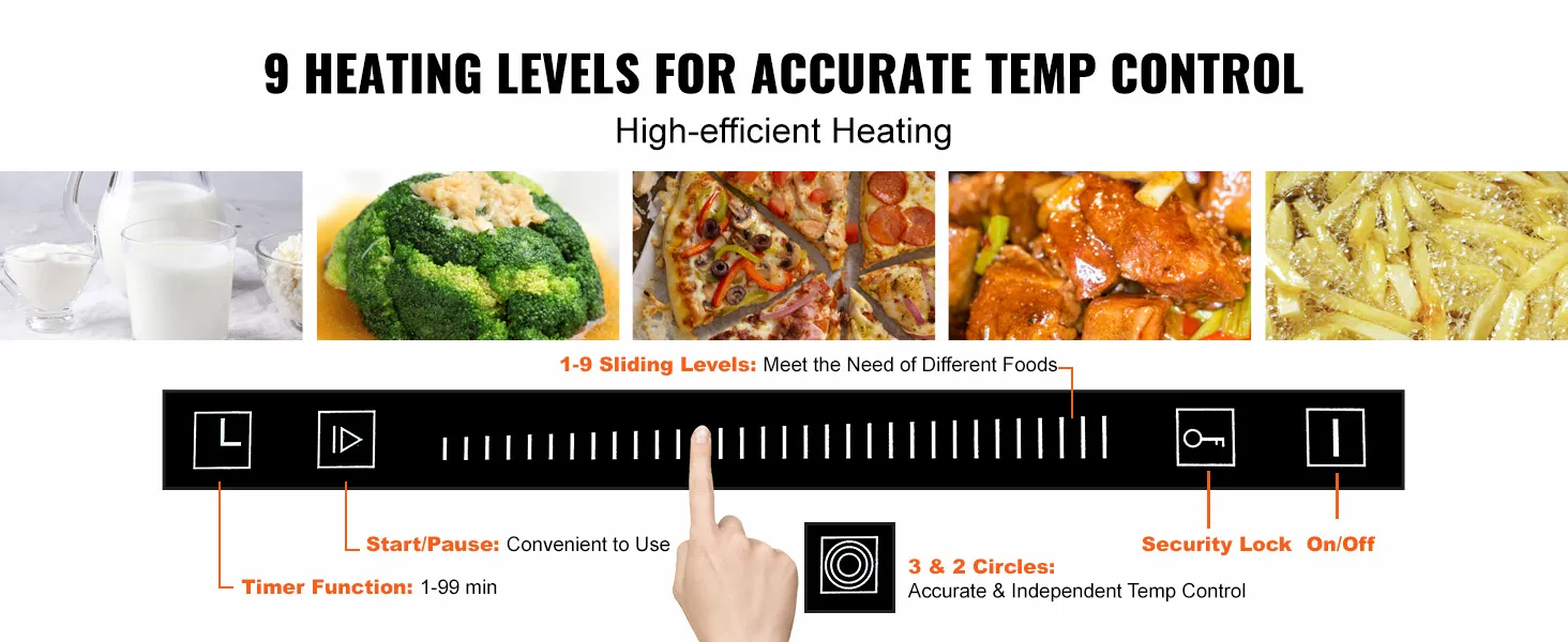 Controles táctiles con sensor digital: nuestra estufa eléctrica incorporada tiene 9 niveles de potencia de calefacción. Con un control de temperatura, le permite cambiar con precisión a diferentes niveles desde hervir hasta hervir a fuego lento. Además, está equipado con un temporizador de 1 a 99 minutos, lo que hace que cocinar sea fácil y agradable. Configura la potencia y el temporizador y deja que la estufa haga el resto. Este panel de control táctil con sensor es ideal para lograr efectos de cocción precisos.
