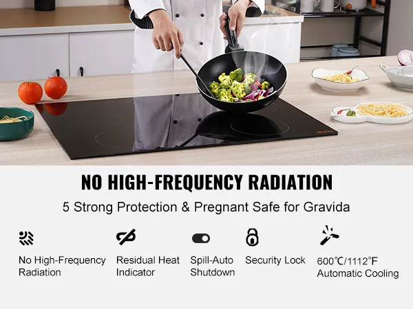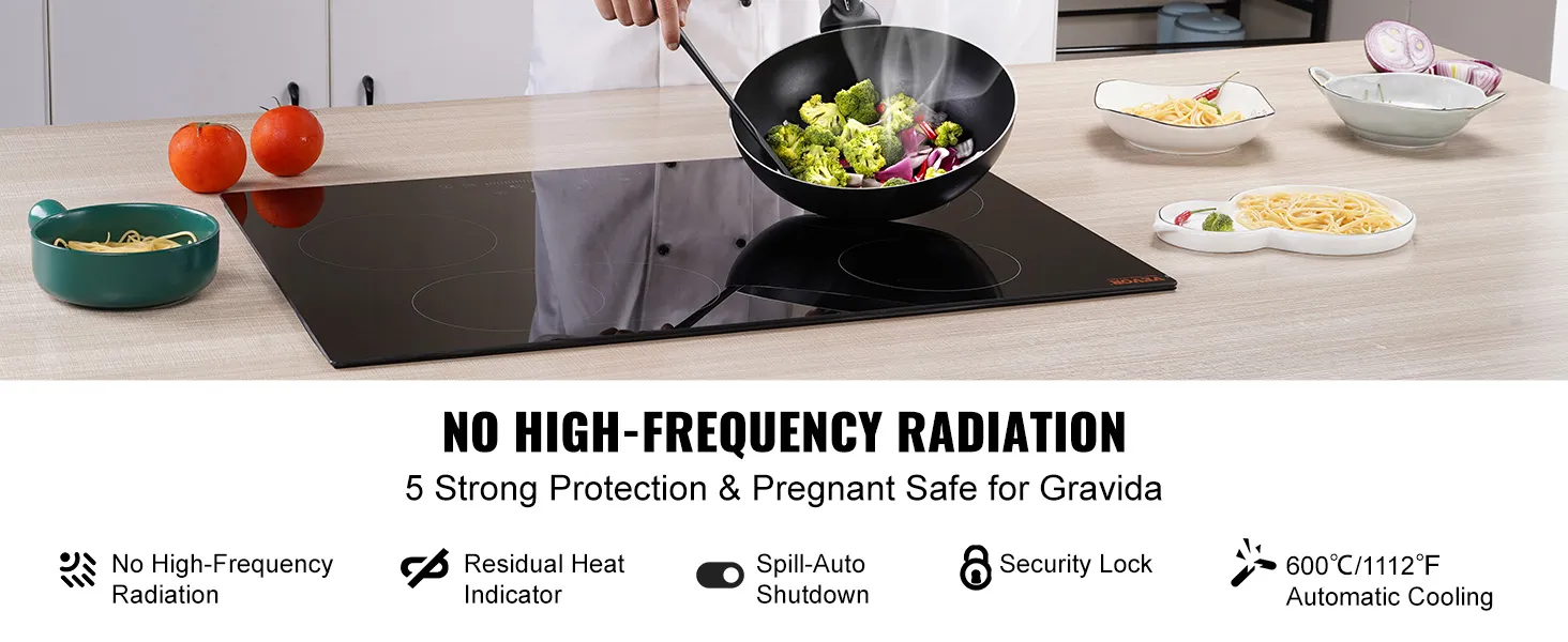 Múltiples funciones de protección: esta estufa eléctrica contiene varias funciones para mayor seguridad. El bloqueo de seguridad para niños evita el contacto accidental, mientras que la protección contra sobrecalentamiento y la función de apagado automático lo protegen de peligros inesperados. Ninguna radiación de alta frecuencia le permite usarlo con confianza. Además, cuando quede mucho calor en la superficie, el recordatorio de calor residual te lo indicará, evitando quemaduras en las manos durante la limpieza. El ventilador necesita funcionar durante un período de tiempo para enfriarse después de apagar la cocina.
