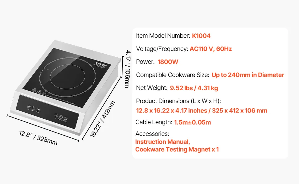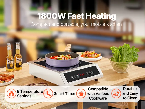 Placa de inducción portátil VEVOR, quemador de inducción comercial de 1800 W con 9 ajustes de temperatura, placa calefactora de acero inoxidable para encimera con temporizador de 3 h y bloqueo para niños, para cocina de restaurante.