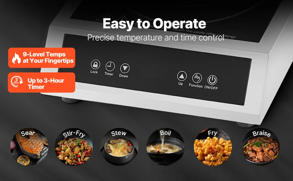 Calentamiento eficiente: con una potencia de salida de 1800 W y una bobina grande, esta placa de inducción comercial portátil garantiza un calentamiento rápido y uniforme. Es ideal para varios estilos de cocción, como hervir, cocinar al vapor, dorar y saltear. Prepara sopas, frijoles, carnes, salsas y pastas sin esfuerzo y a la perfección.