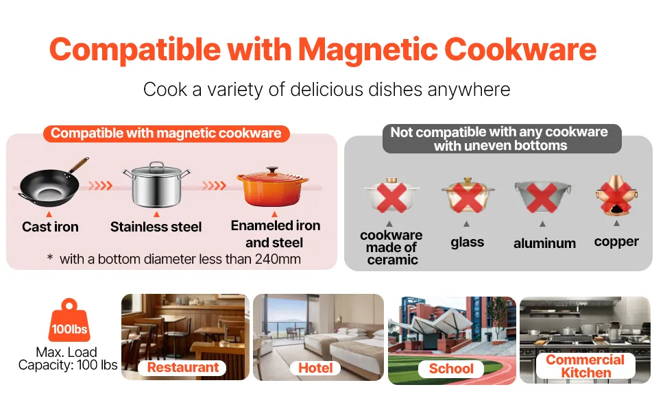 Uso versátil: compatible con utensilios de cocina magnéticos (de hasta 240 mm de diámetro), como hierro fundido, acero inoxidable, hierro esmaltado y acero. Su diseño liviano y portátil es ideal para reuniones, fiestas y diversos usos comerciales.