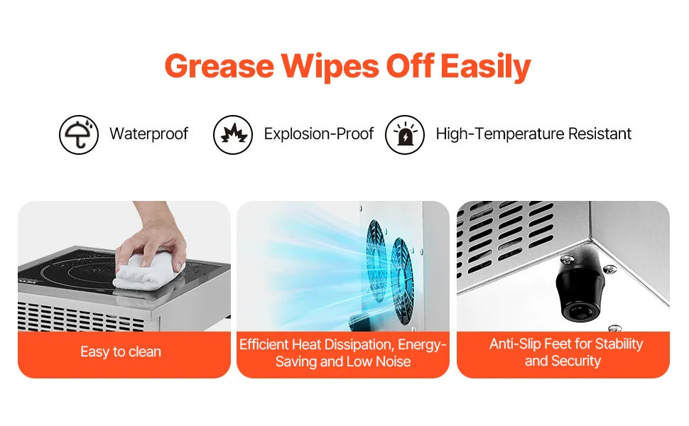 Funcionamiento seguro: esta cocina de inducción, que cuenta con un panel de vidrio microscópico resistente al agua y duradero, resiste las manchas y se limpia con facilidad. El ventilador de refrigeración de alta eficiencia, el bloqueo para niños, el sistema de detección automática y el recordatorio de errores garantizan un uso tranquilo.