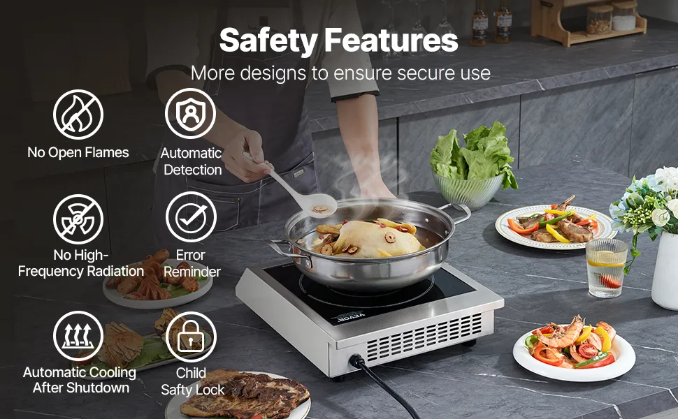 Al no tener llamas expuestas, esta cocina de inducción es más segura que la mayoría de las cocinas tradicionales. Incluye funciones de seguridad esenciales como bloqueo para niños, sistema de detección automática, pausa y protección contra sobrecalentamiento para cocinar con tranquilidad.