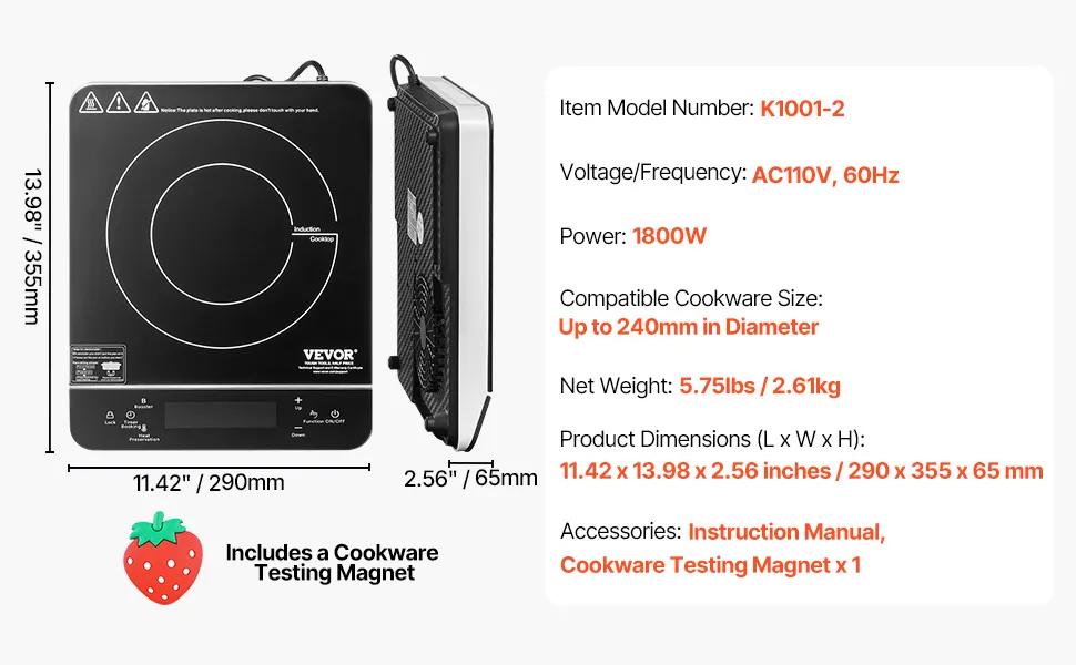 Calentamiento eficiente: con una potencia de salida de 1800 W y una bobina grande, esta placa de inducción portátil garantiza un calentamiento rápido y uniforme. Es ideal para distintos estilos de cocción, como hervir, cocinar al vapor, dorar y saltear.