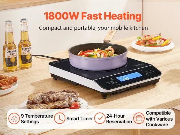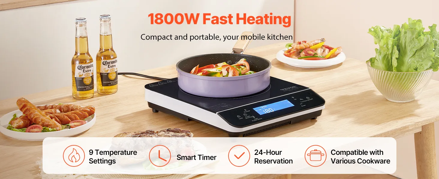 Placa de inducción portátil VEVOR, quemador eléctrico de 1800 W con 9 ajustes de temperatura, placa de inducción de encimera con temporizador de 4 horas, reserva de 24 horas, bloqueo para niños, fácil de limpiar, para cocinar