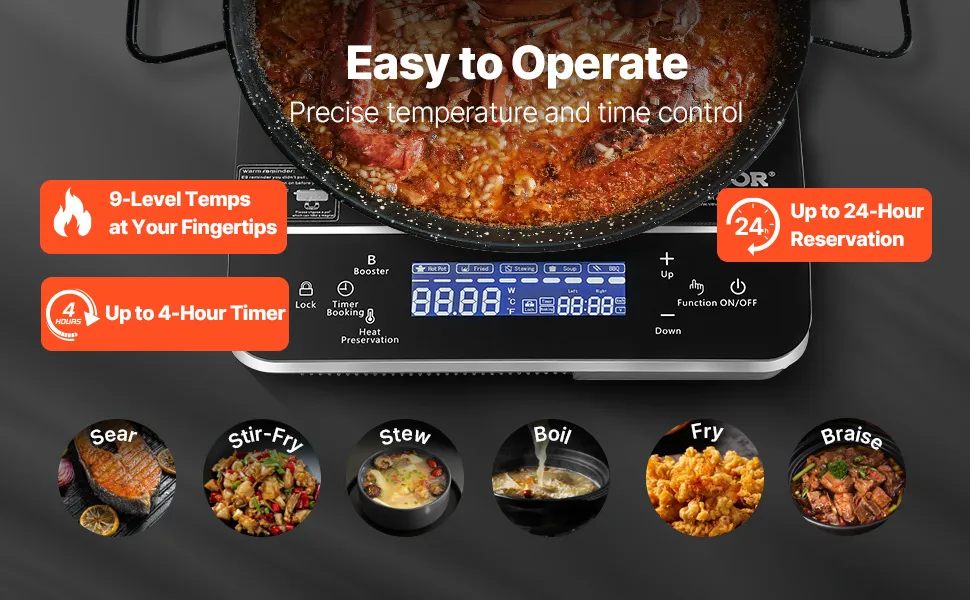Temporizador inteligente y función de reserva: equipada con una pantalla de temporizador, esta placa de inducción es fácil de usar con un temporizador de 4 horas y una función de reserva de 24 horas. Se apaga automáticamente para programar el tiempo exacto para que cocinar sea sencillo y sabroso.