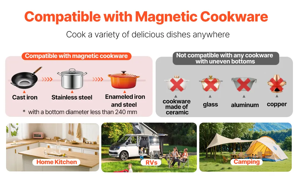 Uso versátil: compatible con utensilios de cocina magnéticos (de hasta 240 mm de diámetro), como hierro fundido, acero inoxidable, hierro esmaltado y acero. Su diseño liviano y portátil se adapta al uso diario en el hogar, reuniones, departamentos de alquiler, vehículos recreativos y viajes de campamento.