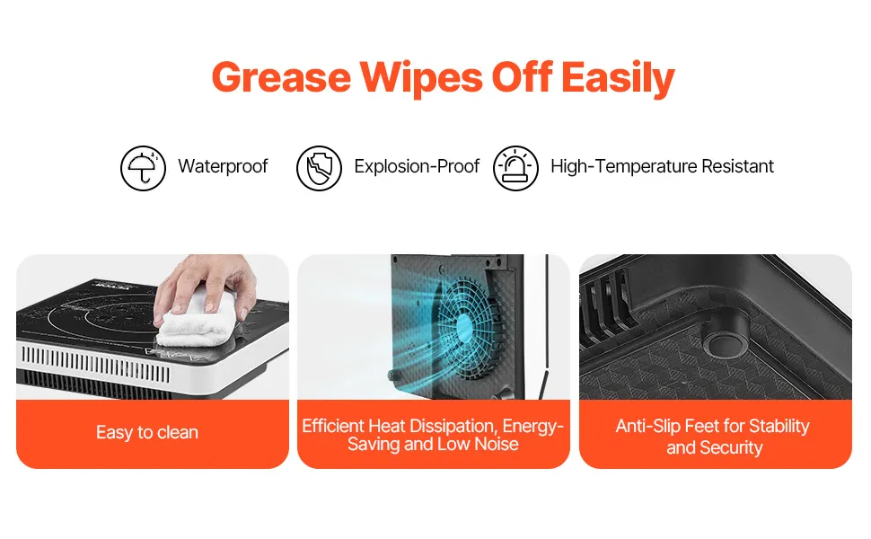 Funcionamiento seguro: esta cocina de inducción, que cuenta con un panel de vidrio microscópico resistente al agua y duradero, resiste las manchas y se limpia con facilidad. El ventilador de refrigeración de alta eficiencia, el bloqueo para niños, el sistema de detección automática y el recordatorio de errores garantizan un uso tranquilo.