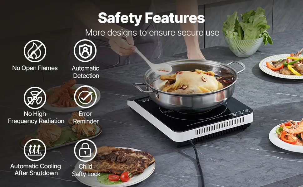Al no tener llamas expuestas, esta cocina de inducción es más segura que la mayoría de las cocinas tradicionales. Incluye funciones de seguridad esenciales como bloqueo para niños, sistema de detección automática, pausa y protección contra sobrecalentamiento para cocinar con tranquilidad.
