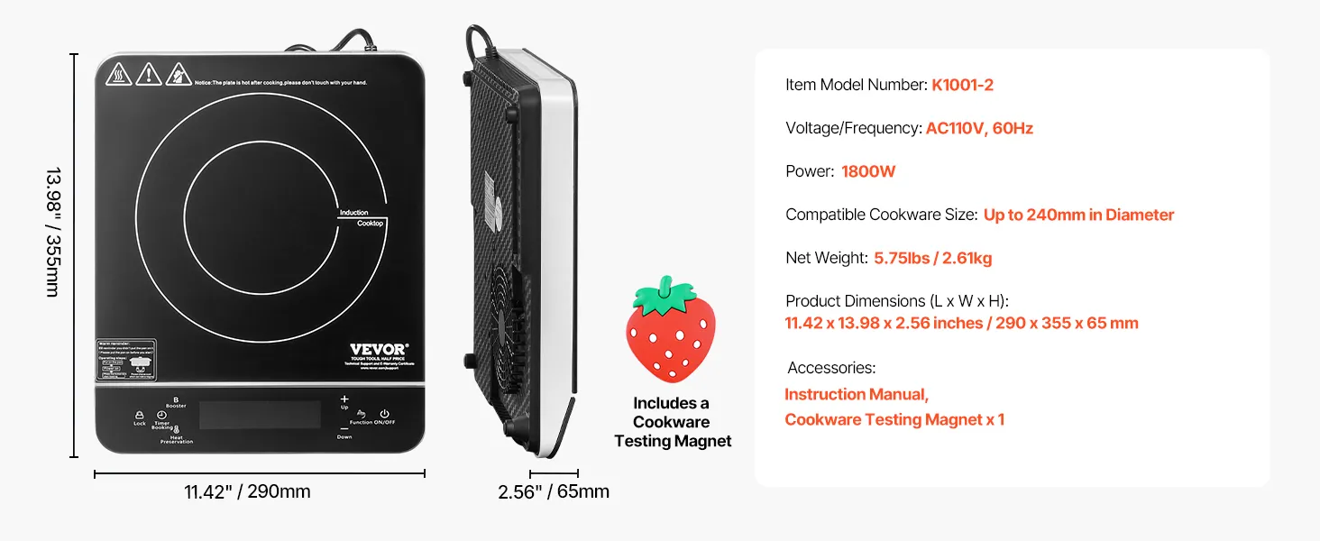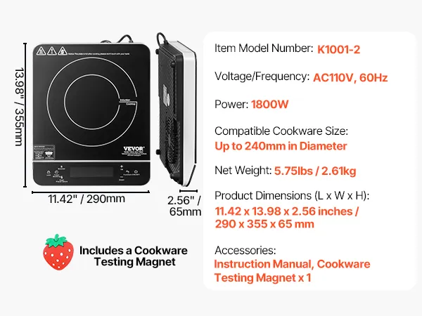 Efficient Heating: With 1800W high-power output and a large coil, this portable induction cooktop ensures fast and even heating. It's ideal for various cooking styles including boil, steam, searing, and stir-fry.