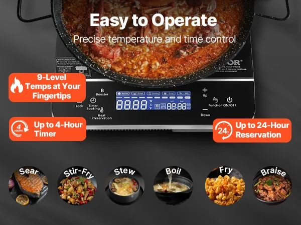 Smart Timer & Reservation Function: Equipped with a timer display, this induction hot plate is easy to use with a 4-hour timer and 24-hour reservation function. It shuts off automatically for exact timing to make cooking hassle-free and flavorful.