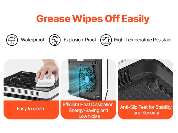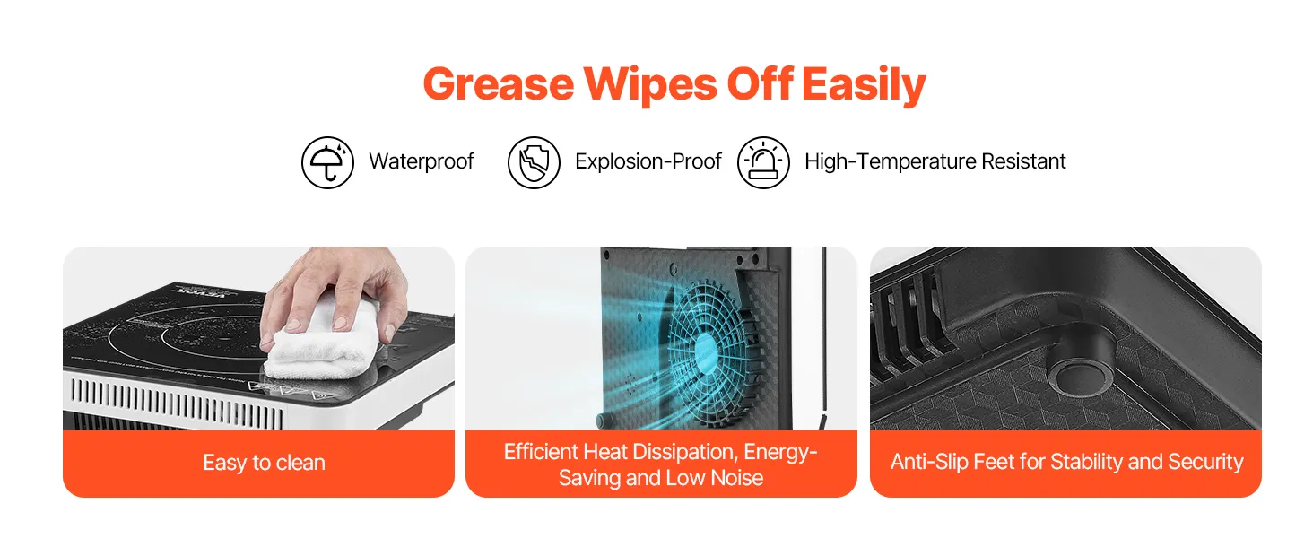 Secure Operation: Featuring a durable, waterproof microscopic glass panel, this induction cooker resists stains and wipes clean with ease. The high-efficiency cooling fan, child lock, automatic detection system, and error reminder ensure use with peace of mind.