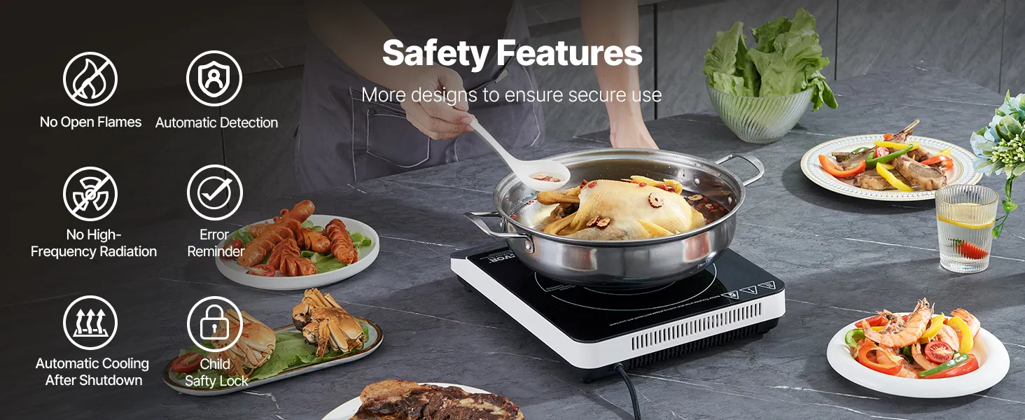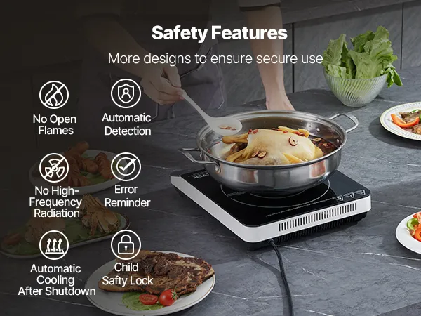 With no open flames, this induction cooker is safer than most traditional stoves. It includes essential secure features like a child lock, automatic detection system, pause, and overheat protection for cooking with peace of mind.