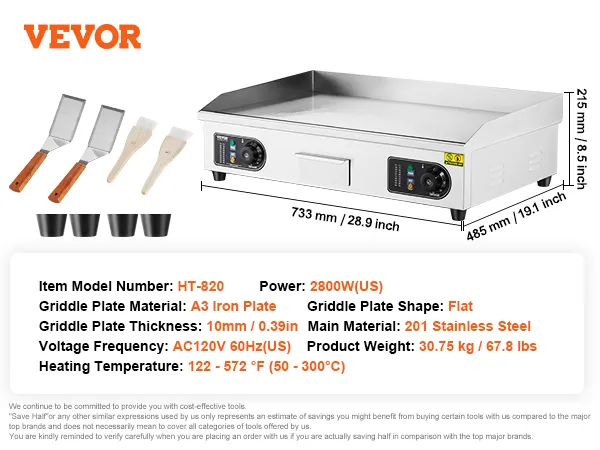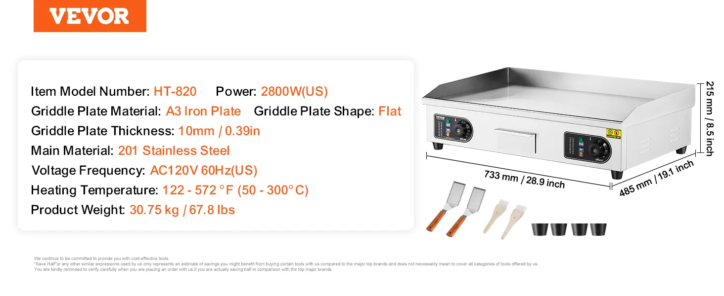 Spacious Cooking Area: Our commercial griddle boasts a high-quality A3 iron plate with a non-stick surface and cast iron cooking surface. The cooking surface measures 28.74 x 15.75 inches, providing ample cooking space at once. You can cook multiple dishes simultaneously on this griddle to meet your fast and high-volume demands.