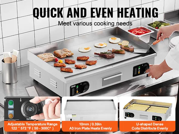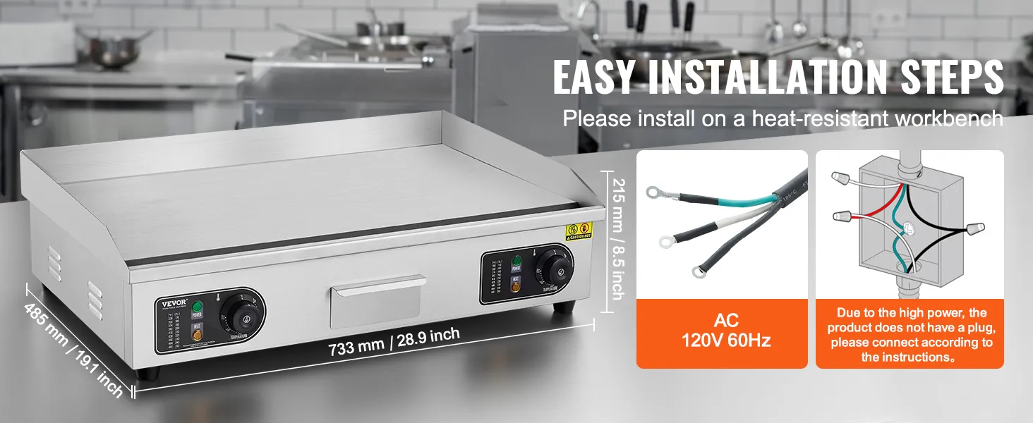 Even Heating: The commercial electric griddle features an upgraded thickened 10mm / 0.39in iron cooking plate. The U-shaped dense heating tubes are evenly distributed, ensuring uniform temperature across the entire grill. The high-power setting allows for rapid heating of food. NOTE: To prevent circuit breakage, this griddle is compatible with Single-Pole Circuit Breaker (>30Amp).