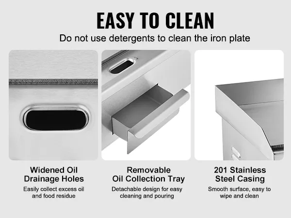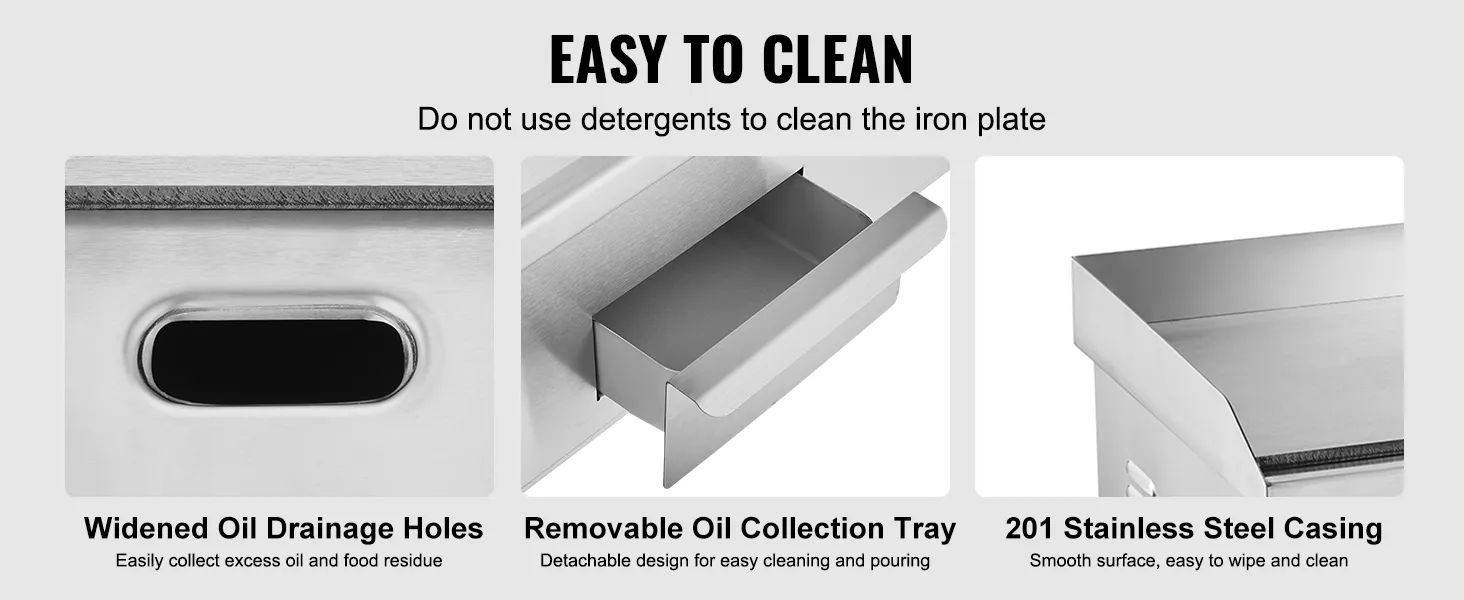 More Details: The widened oil drain hole of the flat top electric griddle helps remove waste oil. The oil collection tray gathers waste oil and food, making it easy to dispose of. Rubber feet make the griddle more stable. The raised oil baffle prevents oil splashes.