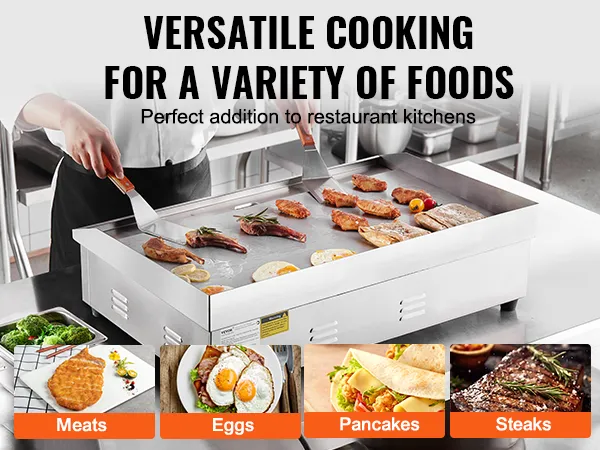 The flat top electric griddle is perfect for cooking meats, eggs, pancakes, steaks, and more. It is suitable for both home and commercial kitchens.