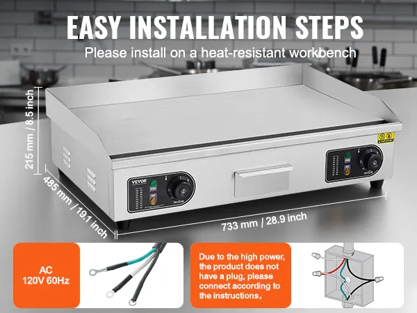 Please install the electric commercial griddle on a heat-resistant workbench, reserving enough space for the power cord.