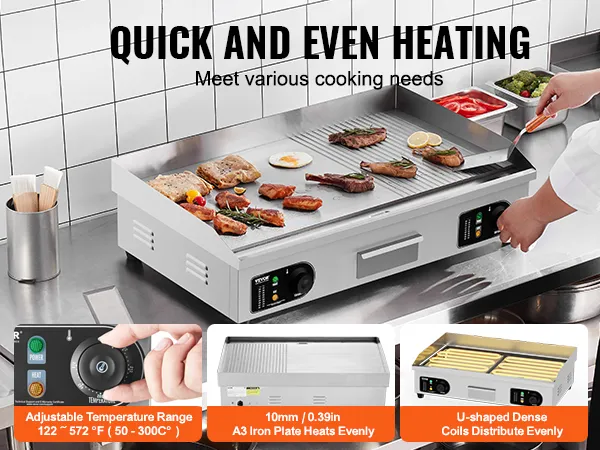 Calentamiento uniforme: la plancha eléctrica comercial cuenta con una placa de cocción de hierro engrosada mejorada de 10 mm/0,39 pulgadas. Los densos tubos calefactores en forma de U están distribuidos uniformemente, lo que garantiza una temperatura uniforme en toda la parrilla. La configuración de alta potencia permite calentar rápidamente los alimentos.