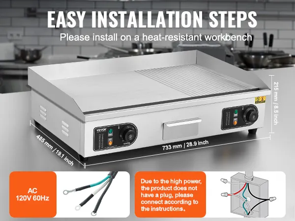 Instale la plancha eléctrica comercial en una mesa de trabajo resistente al calor, reservando suficiente espacio para el cable de alimentación.
