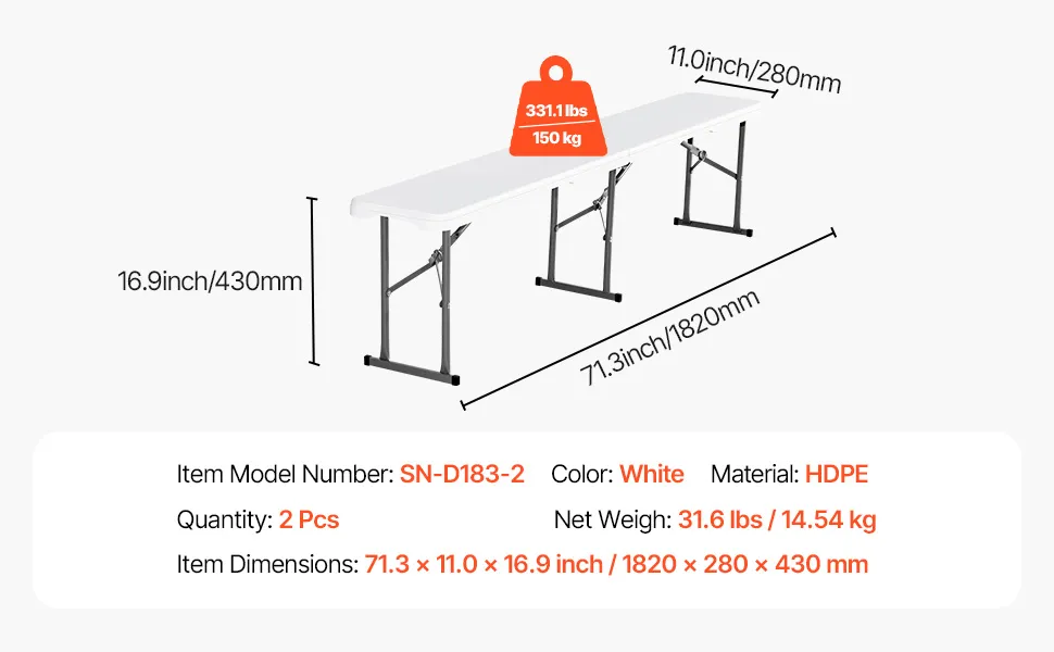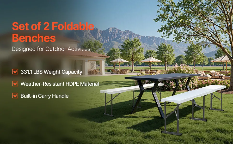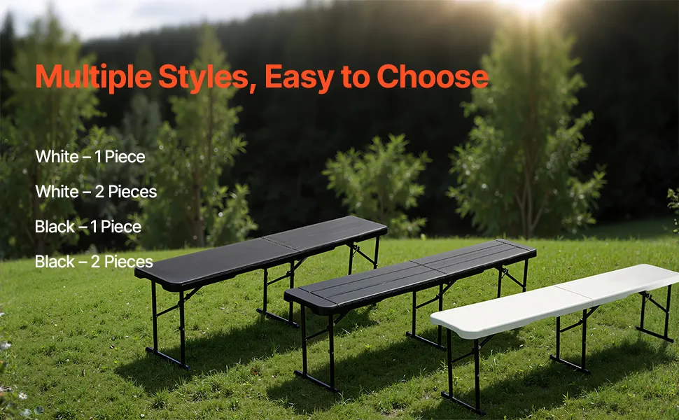 Asientos cómodos: este banco plegable de 1,82 m(72 x 11 x 17 pulgadas) de 1,82 m(2 piezas) y 1,83 m(6 pies) es muy portátil y liviano, y ofrece asientos cómodos sin necesidad de ensamblaje. Simplemente desempaquételo y úselo.